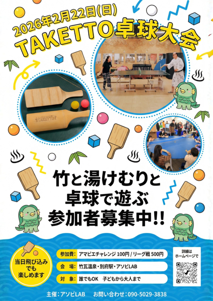 2/22(日)TAKETTO卓球大会を別府駅構内・竹瓦温泉前・アソビLABで開催いたします!